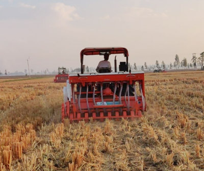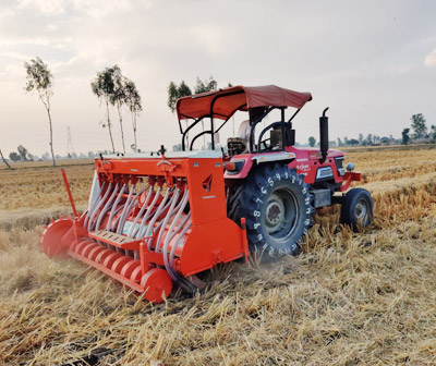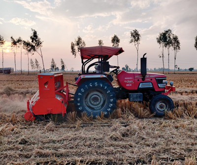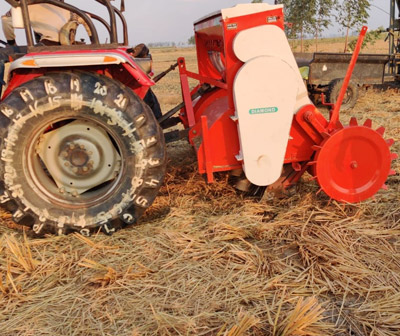 The Happy Seeder is a tractor PTO operated machine that cuts and lifts paddy / straw, sows wheat and other crop seeds into the bare soil and deposits the straw over the sown area as mulch.